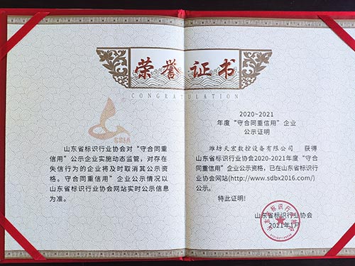 單位榮獲“山東省標(biāo)識(shí)行業(yè)協(xié)會(huì)”會(huì)員單位,2020-2021年度“守合同,重信用”公示企業(yè)。